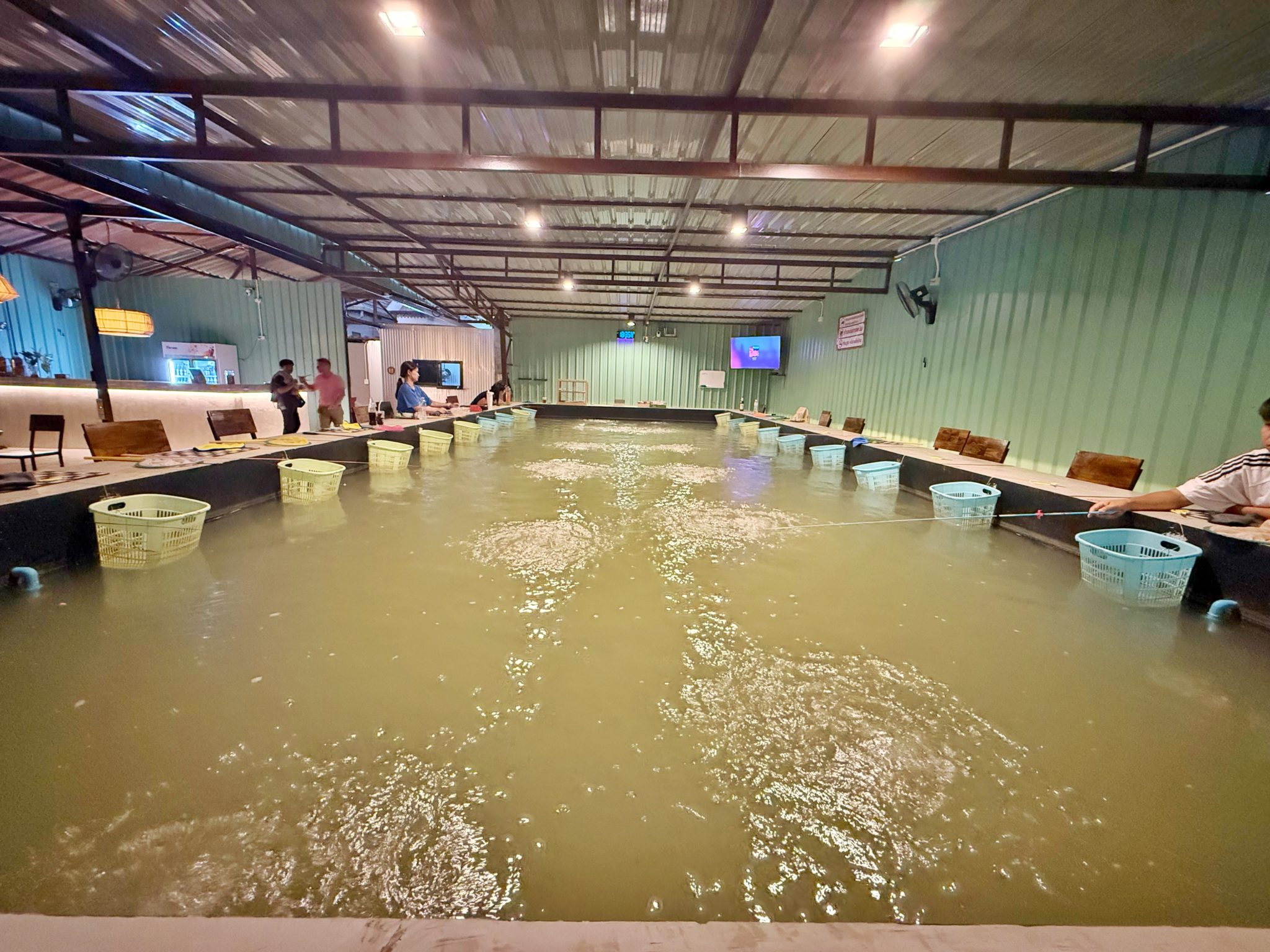 気になるエビ釣堀は昔ながらの濁り池タイプ。席数は二十席で、チェンマイでは小型のお店になります。