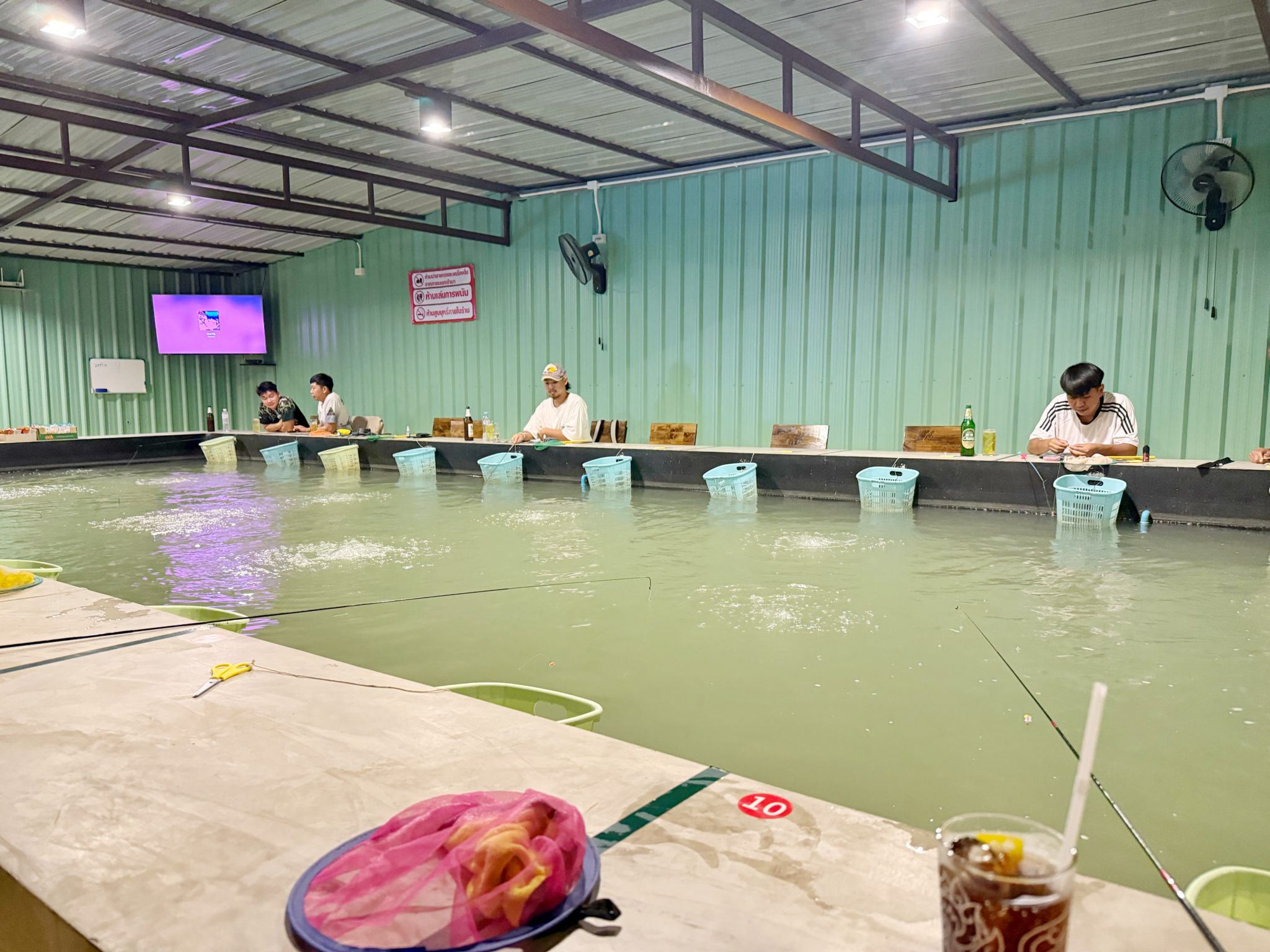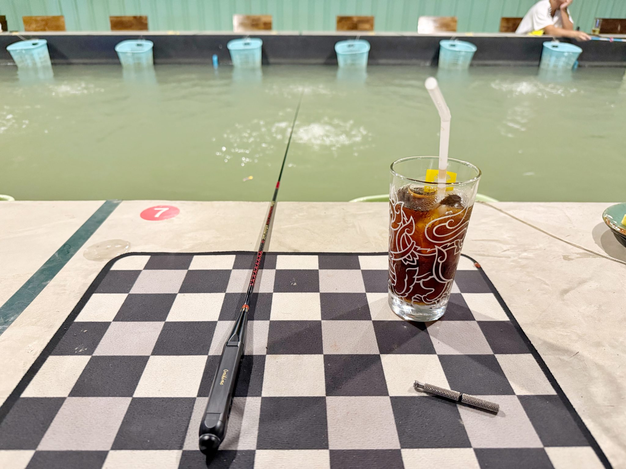 コーラをオーダーして、水深を測ってエビ釣りを開始!池の深さはチェンマイの他の池に近くて、いつもの短めの仕掛けが使えます。席幅が広くて、隣の人とのスペースが広いことが特徴的です。