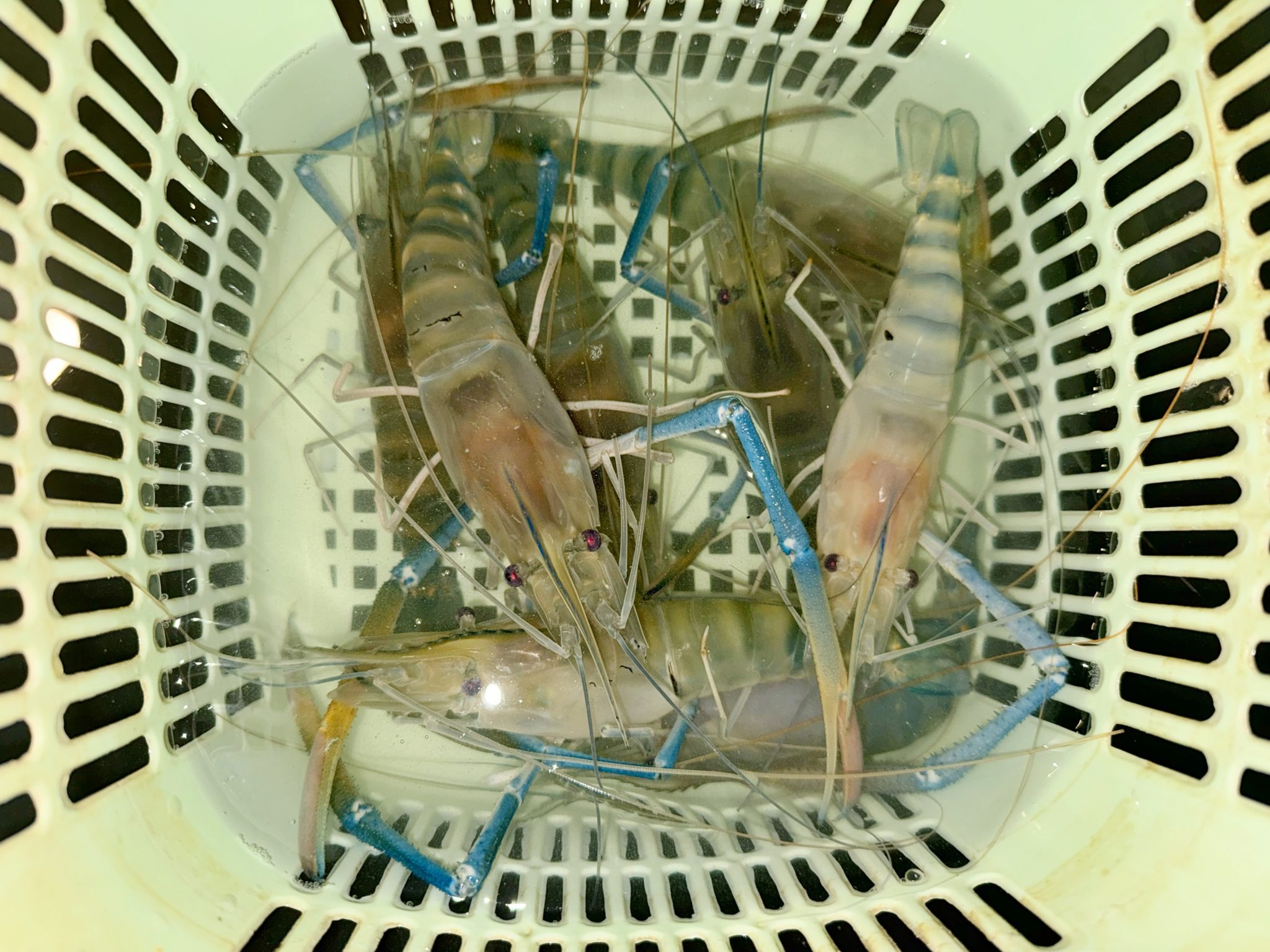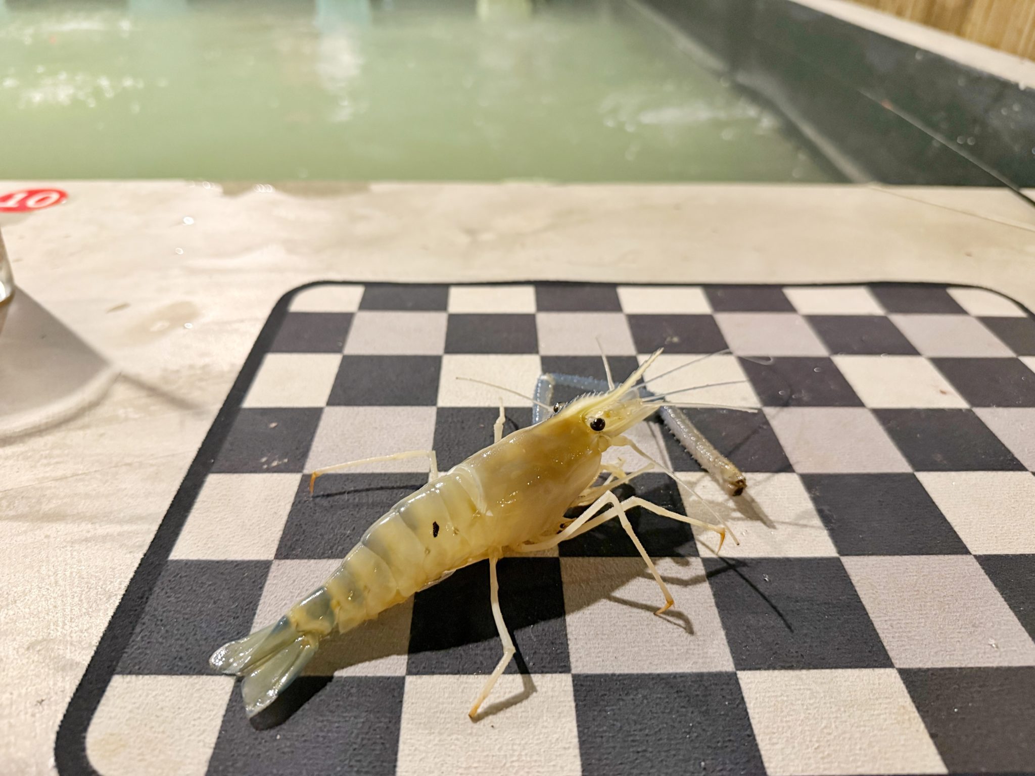 ここのエビ釣りで面白いのが、昔ながらのエビ釣り堀でバクテリアがしっかりと仕事をしているので、エビが驚くほど元気で力強いです。最近のエビ釣堀は青色に着色してあり綺麗なのですが、青色に着色すると水質管理が難しいようです。