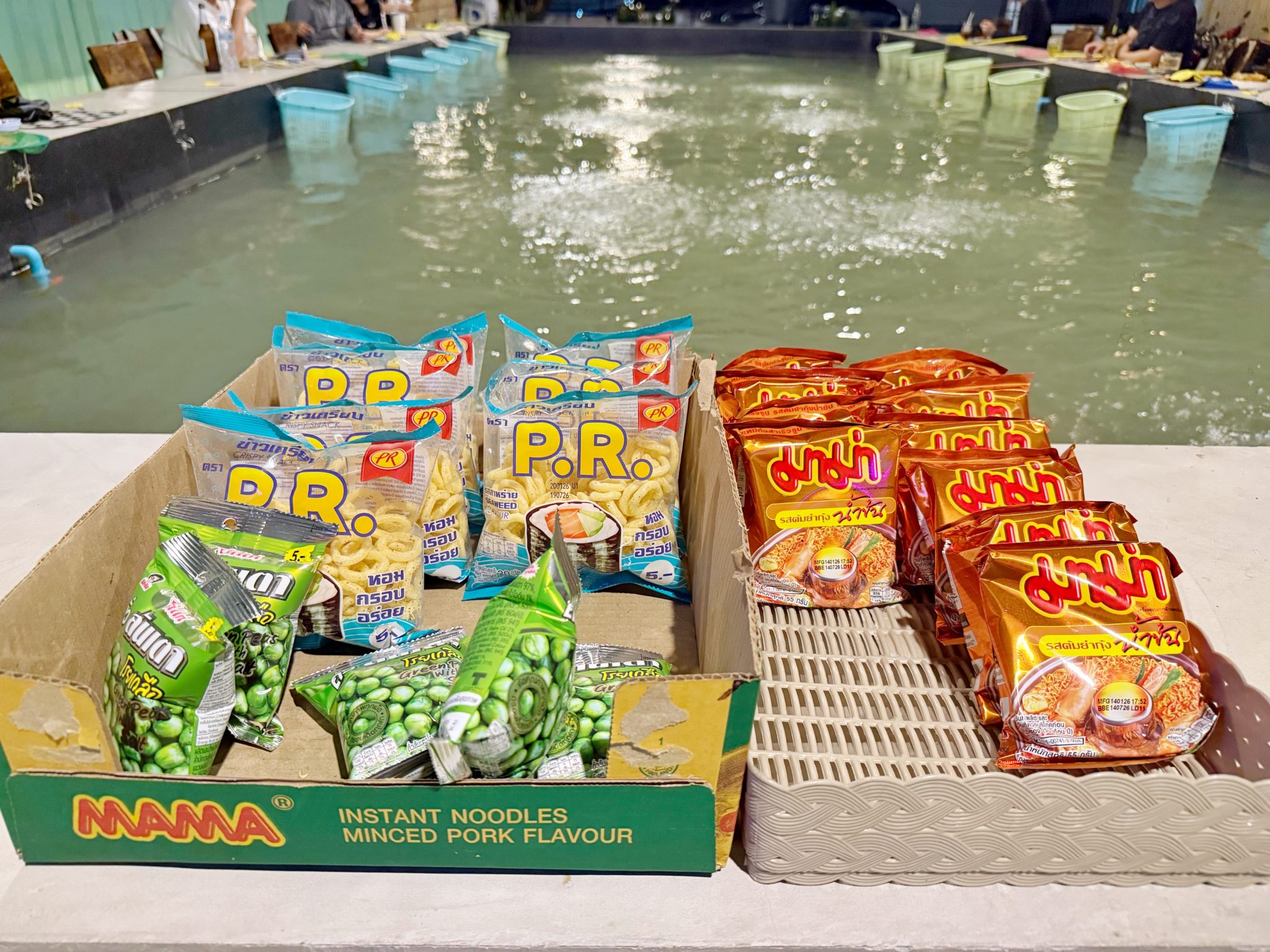 この昔ながらのタイのエビ釣り文化に癒されます。左がお菓子で、右がトムヤンクンのインスタントラーメンです。この三つはどれを選んでも美味しくてセンスも抜群です。