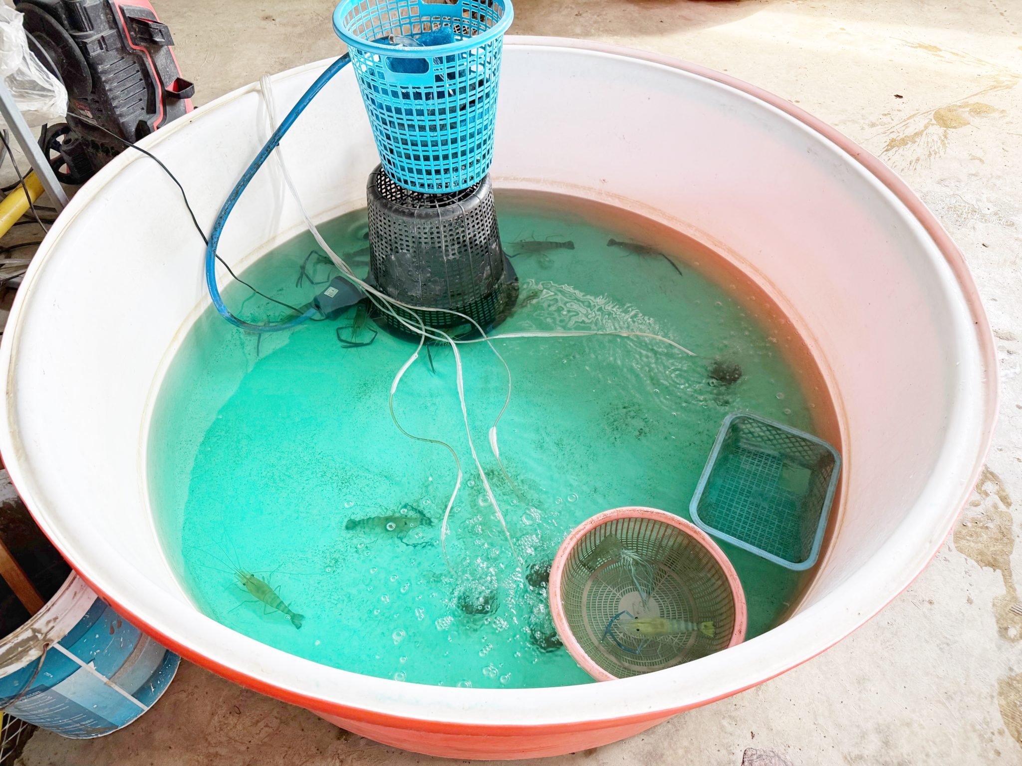池のすぐ隣には、放流用のエビが待機していました。