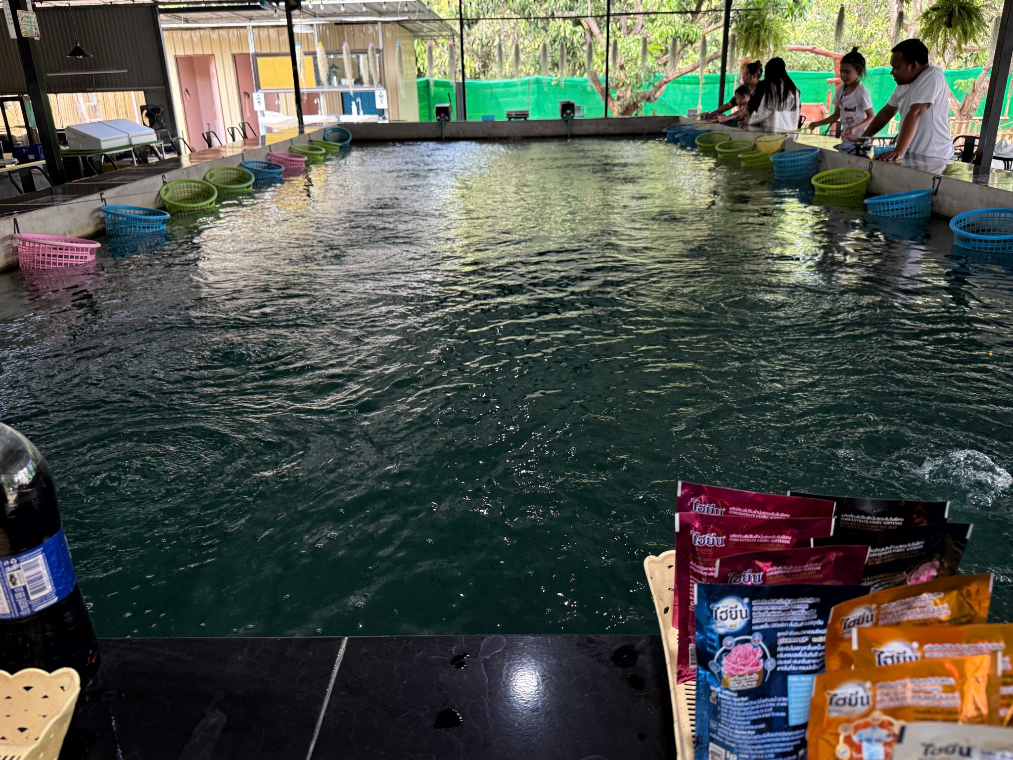 気になるエビ釣堀は24席のチェンマイ標準中型タイプ。水深は少し浅めで、チェンマイの規格通りのエビ釣り堀です。